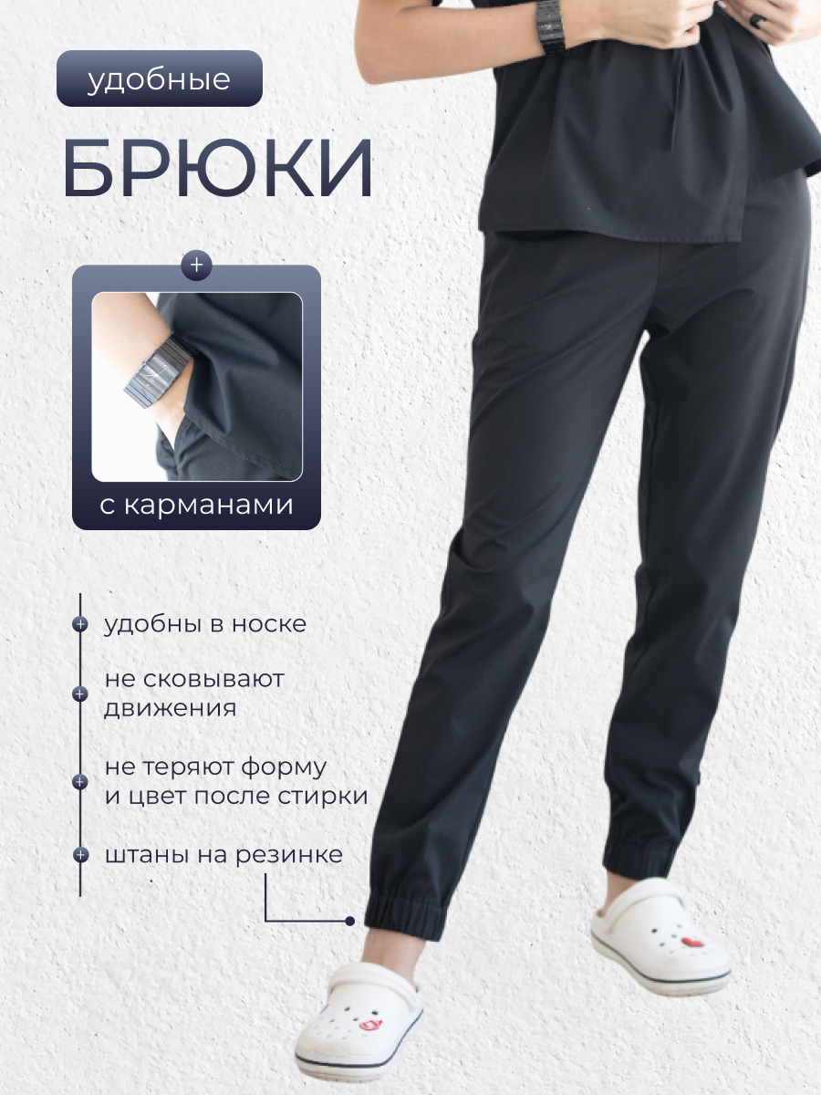 джоггеры от черного костюма Цвет - черный Состав - 35% Хлопка 65% Полиэстр Пол - Женский Размер на модели - 44 Рост модели на фото - 170 см Страна производства - Россия
