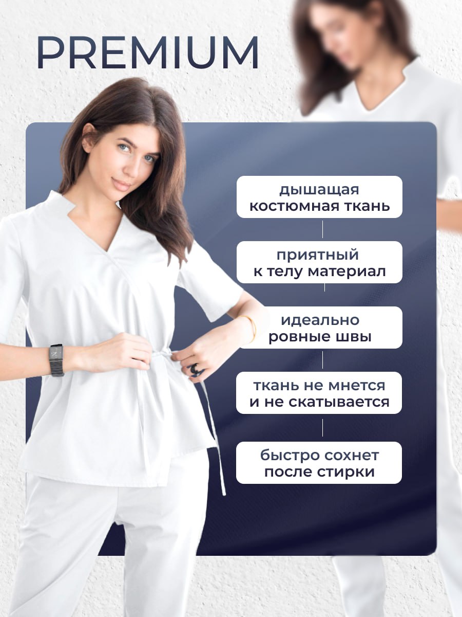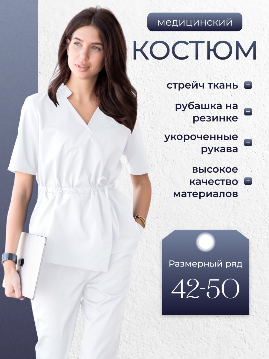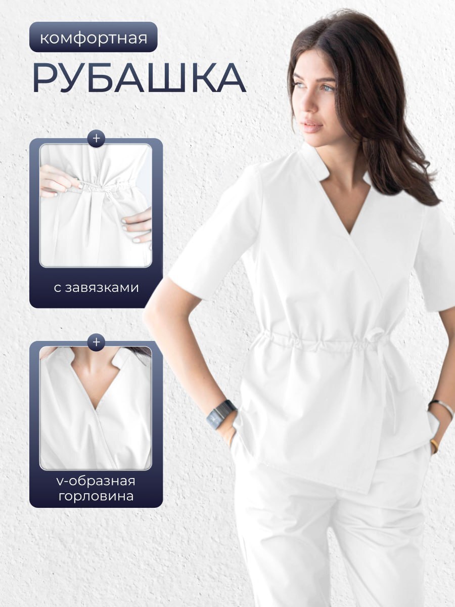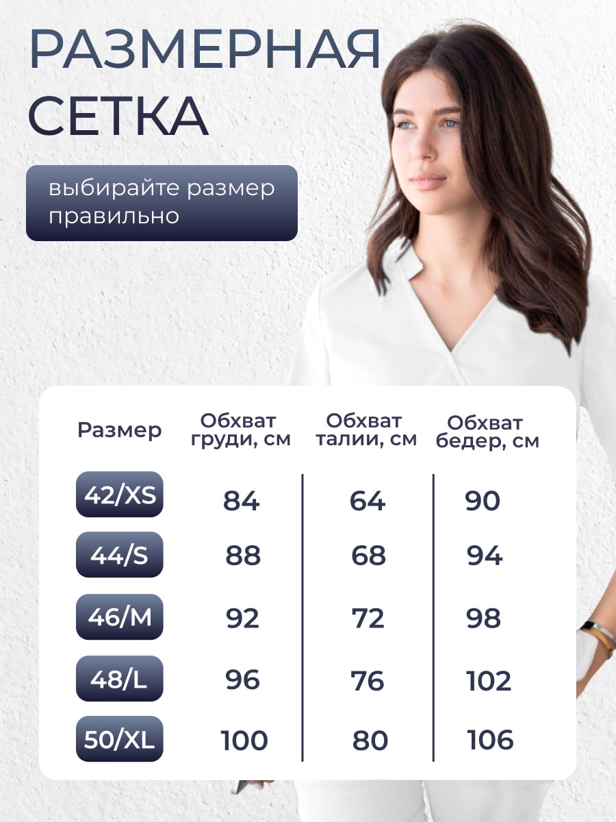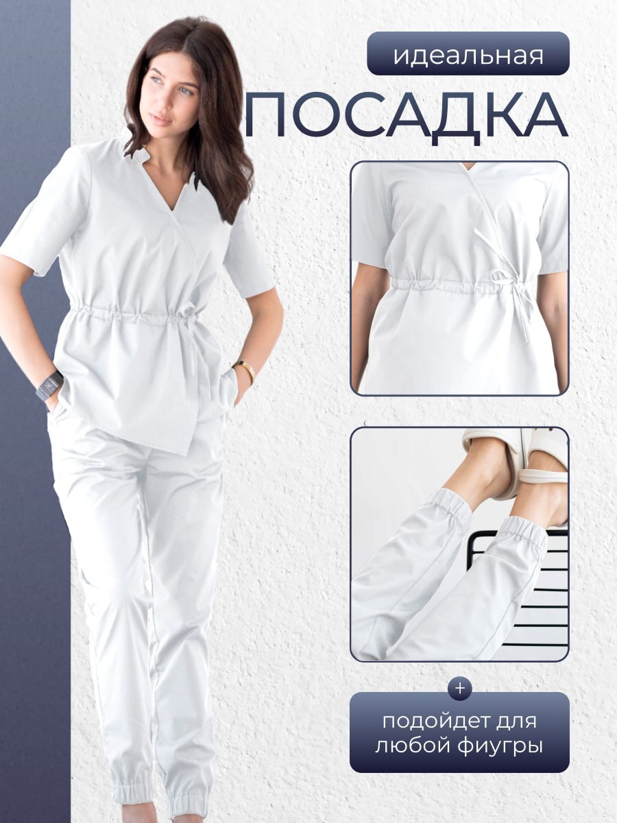 Цвет - белый Состав - 35% Хлопок 65 % Полиэфир Пол - Женский Размер на модели - 42 Рост модели на фото - 170 см Параметры модели на фото 96-76-96 Вид застежки - завязки Особенности модели - воздухопроницаемость Тип рукава - короткие Тип карманов - в шве Уход за вещами - стирка при t не более 40°C Страна производства - Россия Комплектация - брюки и блуза