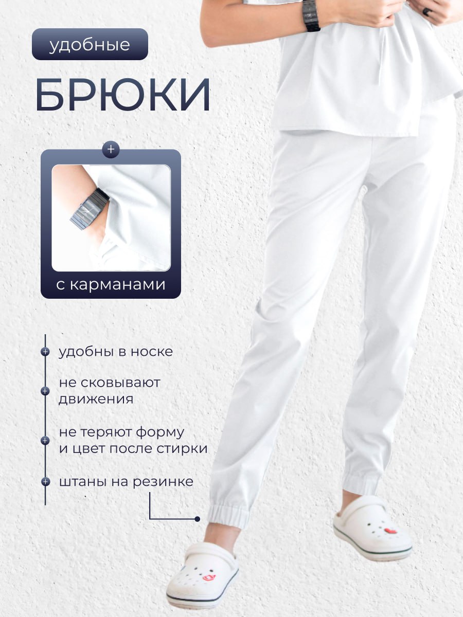 Цвет - белый Состав - 33% Хлопка / 65% Полиэстр / 2% Спандекс Пол - Женский Размер на модели - 42 Рост модели на фото - 170 см Параметры модели на фото 96-76-96 Особенности модели - воздухопроницаемость Уход за вещами - стирка при t не более 40°C Страна производства - Россия Комплектация - штаны